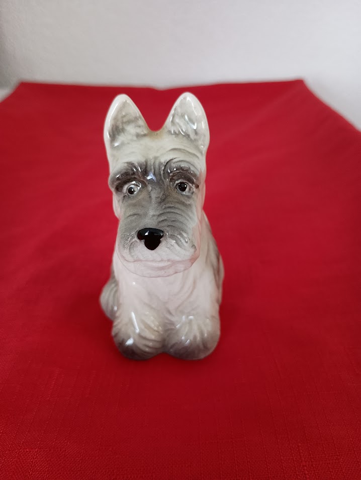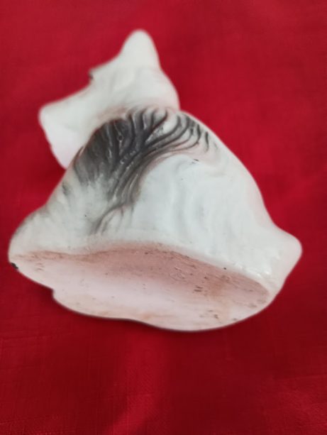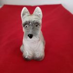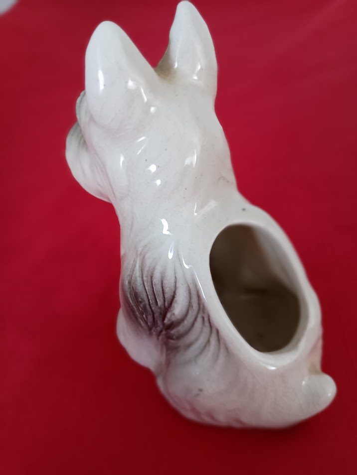 Vintage Scotty dog planter.  Approximately 4″ high. White and gray.